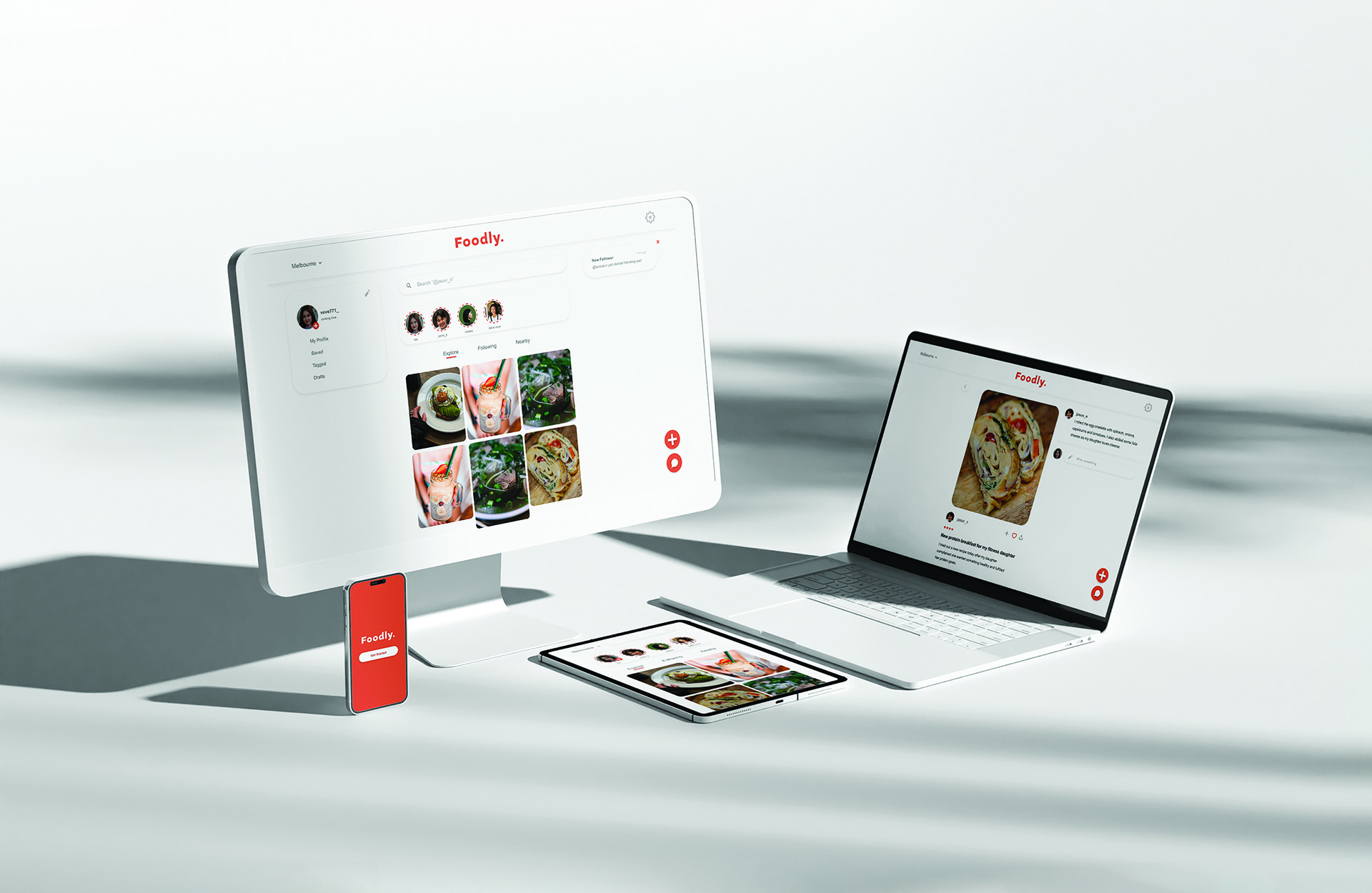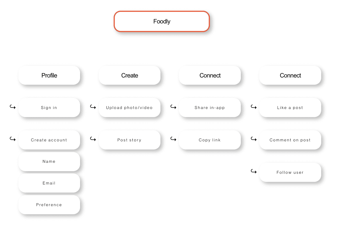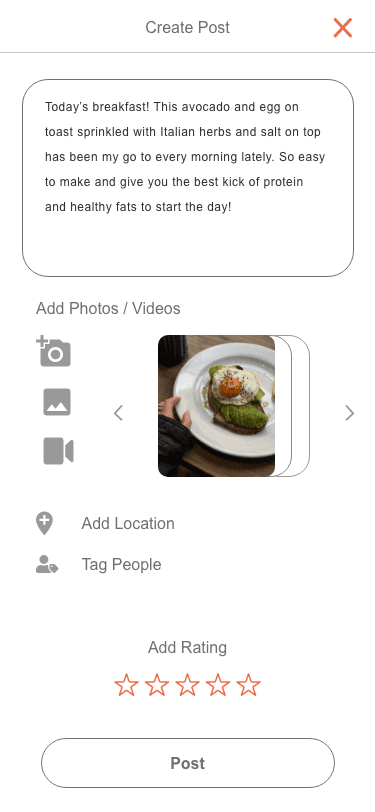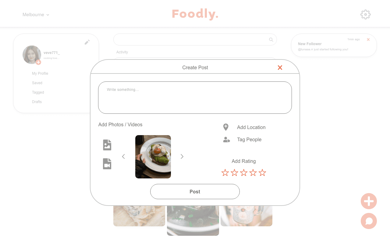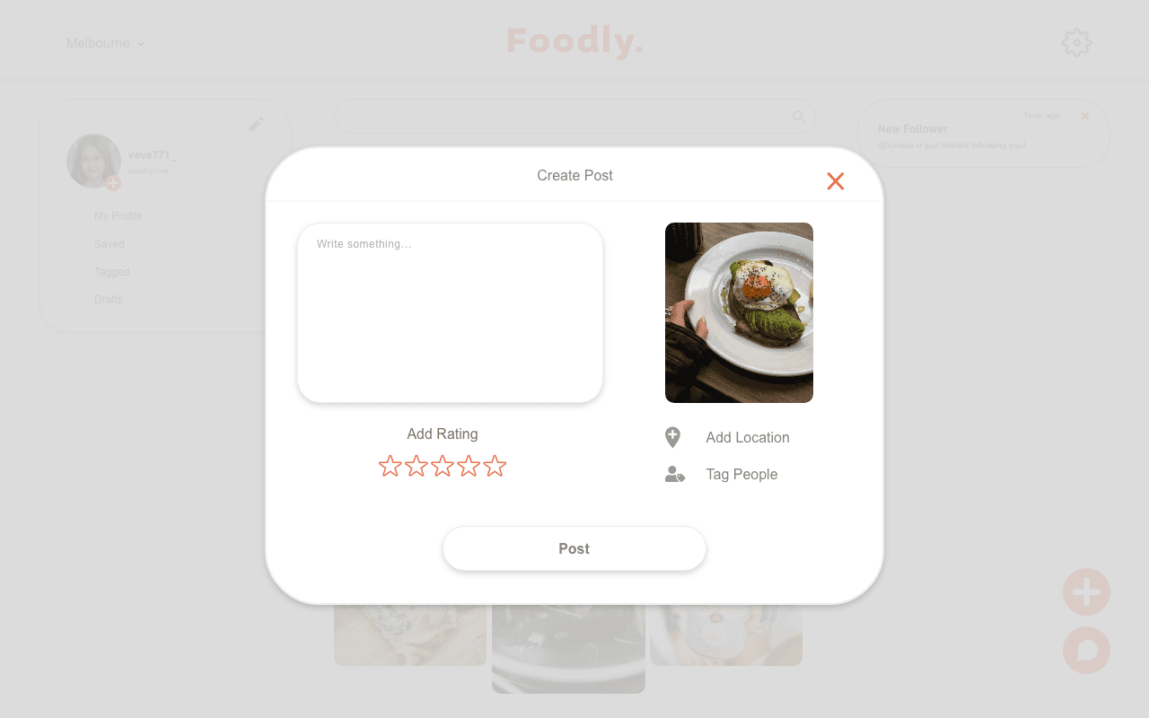 Because she loves sharing food moments, Chloe uploads her first post, a photo of her brunch that morning, paired with a short story about the restaurant and the dishes she enjoyed. Feeling excited to document future meals and discoveries, Chloe shares 'Foodly' with her foodie friends, hoping they’ll join her and exchange inspirations.